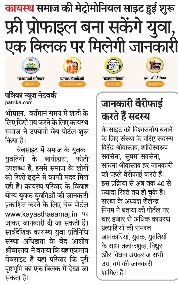 कायस्थ विवाह योग्य युवक युवतियों की समस्त जानकारी कायस्थ समाज वेब पोर्टल पर उपलब्ध